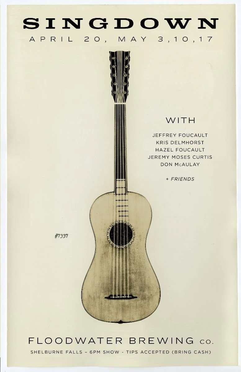 THE SINGDOWN – in April and May we'll also convene the regulars, and an assortment of surprise guests, at our local bar, Floodwater Brewing Co., in Shelburne Falls, MA., for a Monday and three Sunday nights (4/20, 5/3, 5/10, 5/17 respectively). These are free shows, and we set up in the middle of the bar facing inward, and play through amps on the floor by our chairs, singing through a vocal mic hung from the ceiling on a swivel, taking turns trading up the songs we know and which run the gamut from Blondie to Kenny Rogers, Dire Straits to the Louvin Brothers, Cole Porter to Sade. It's a beer bar, no wine or booze, a tiny little joint right on the river. During business hours it generally contains at least one dog and one baby. I'm pretty sure Zack only opened the place so his Dad would have somewhere to play cribbage. Come visit.